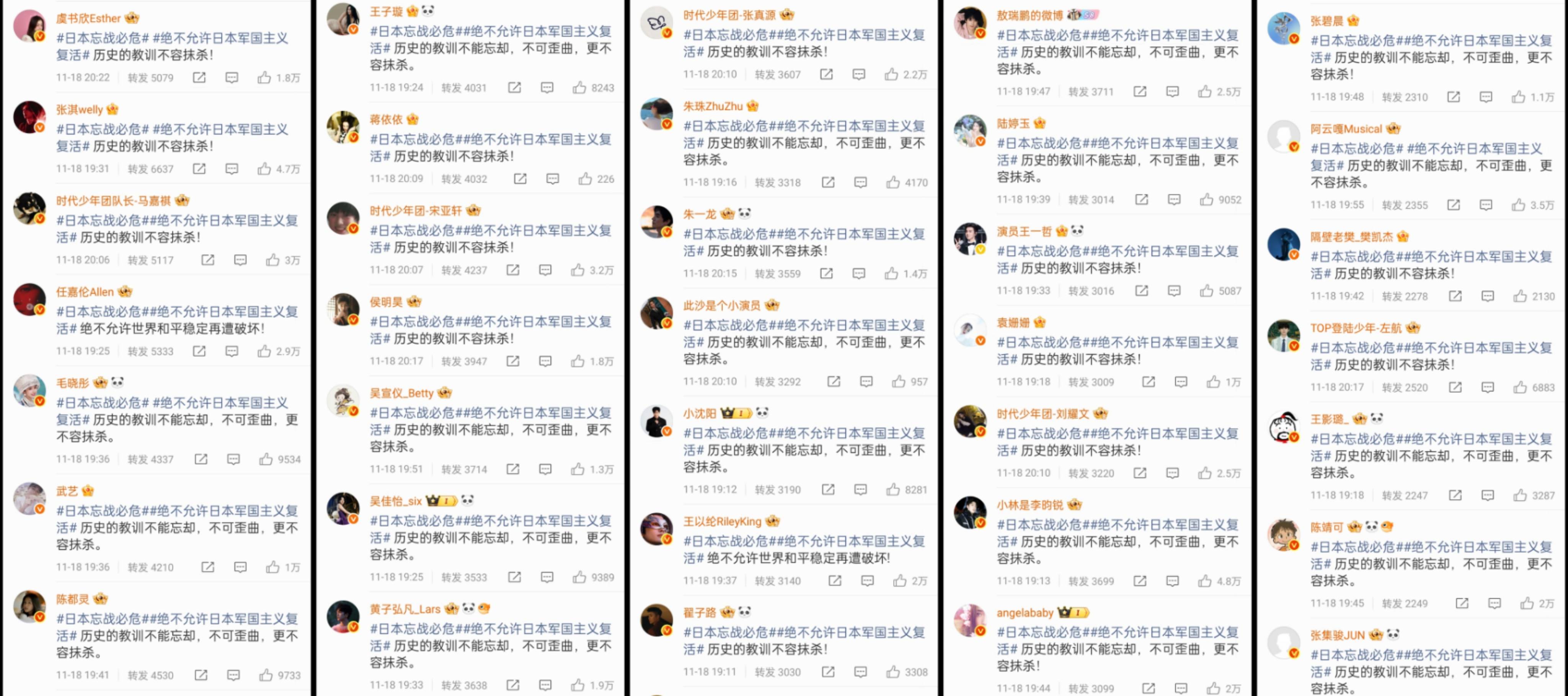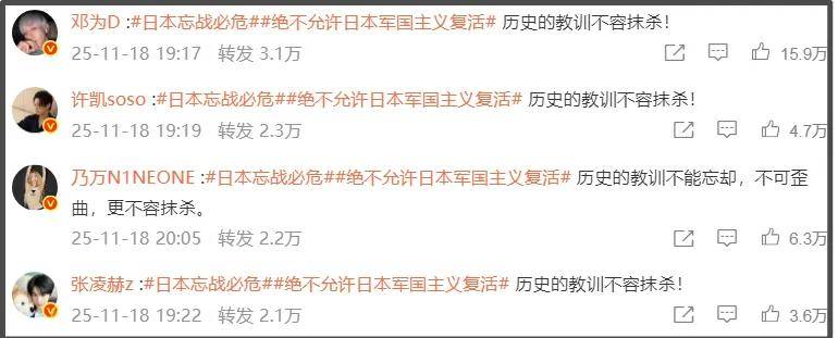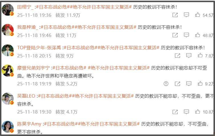 浏览转发区,大约有近两百位艺人参与转发,都表示历史的教训不容抹杀,督促日本忘战必危。转发量较大有肖战、吴磊、田栩宁等新生代,像陈昊宇、刘宇宁等等也都在热门转发区,而如黄晓明、杜江等艺人的转发就靠后。总的来说除了一线艺人转发外,二三线及短剧的演员也加入其中,可以看出此次形势非常关键。