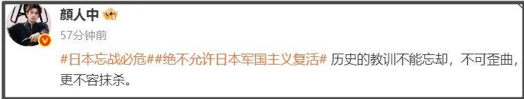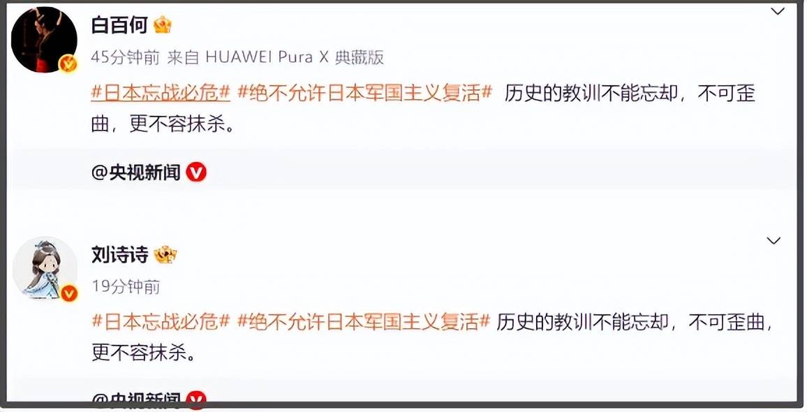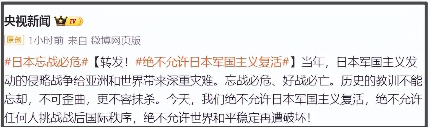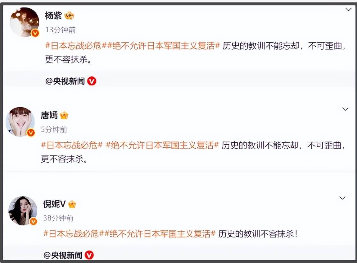 央视新闻发文称要时刻牢记“忘战必危,好战必亡”,不允许任何人挑战战后国际秩序及和平。随后,众多明星纷纷转发。