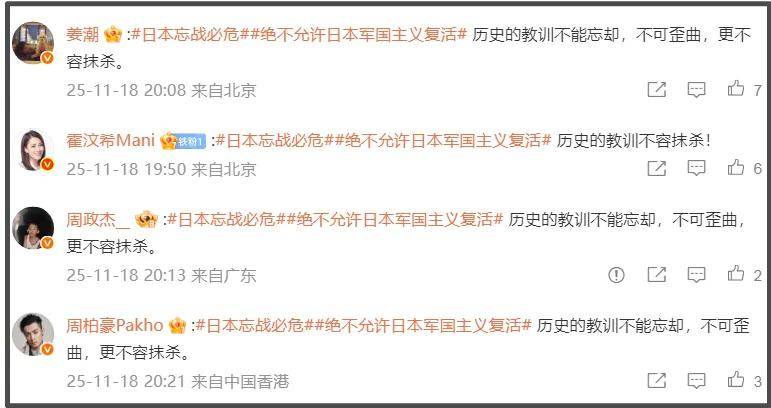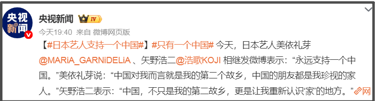 而泰籍华裔李紫婷也坚决表示不允许日本军国主义复活,历史的教训不容抹杀。此外,美依礼芽、矢野浩二表态坚持一个中国原则也得到央视新闻的点赞,可见中国对立场正确的日本艺人持欢迎态度。
