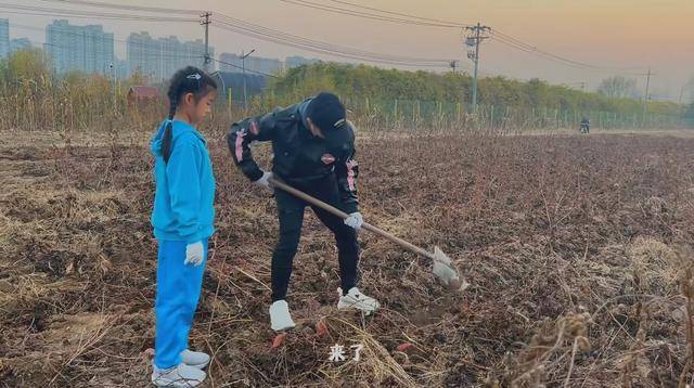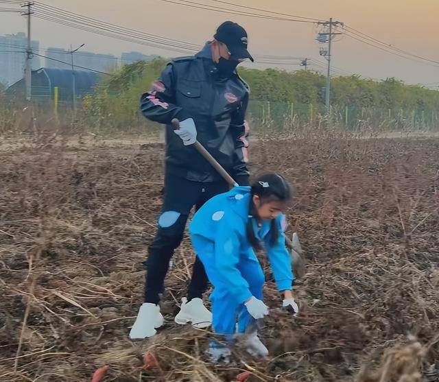 一开始汪峰拿着铁锹在拔红薯的叶子,醒醒在旁边看着觉得好有意思,便跟爸爸撒娇也想体验一下拔红薯。