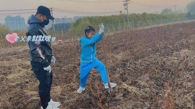 视频中汪峰穿着一身休闲套装,醒醒则是穿着亮眼的蓝色运动服,父女俩拿着铁锹在拔红薯。