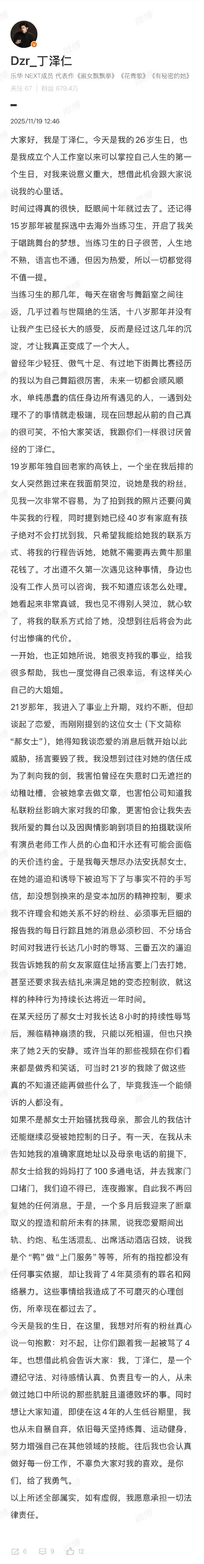 11月19日,丁泽仁发长文再聊当年“唯一的姐”一事,称当年认识了一个“大姐姐”,在得知他谈恋爱后,对他进行精神控制、骚扰他的母亲,迫不得已搬家失联后,又开