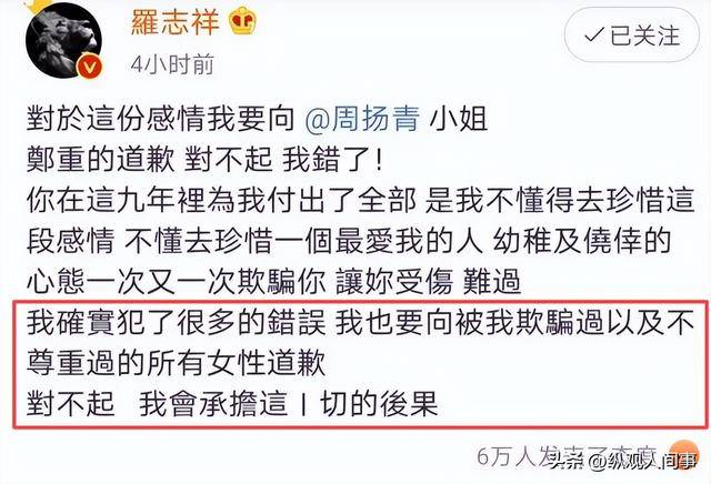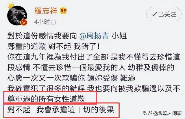 当然,这些都是罗志祥自曝的,除此之外他还针对“时间管理大师”这个词向公众进行了道歉,表示不应该因为自己导致这么一个正能量词,被染上了“桃色”。