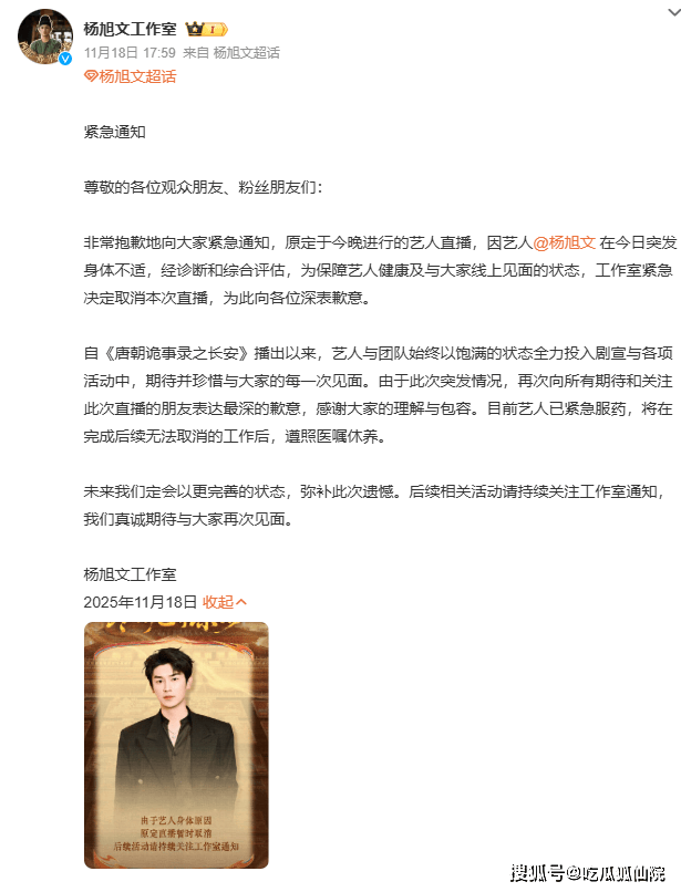 消息传出后,粉丝们纷纷在社交媒体上表达对杨旭文的关心与担忧,“希望旭文能快点好起来,一定要注意身体啊”“工作再忙也要照顾好自己,期待你早日康复” 等留言刷屏。杨旭文所在的经纪公司也很快发布声明,向公众通报了他的身体状况,并表示会调整后续工作安排,让他安心养病。