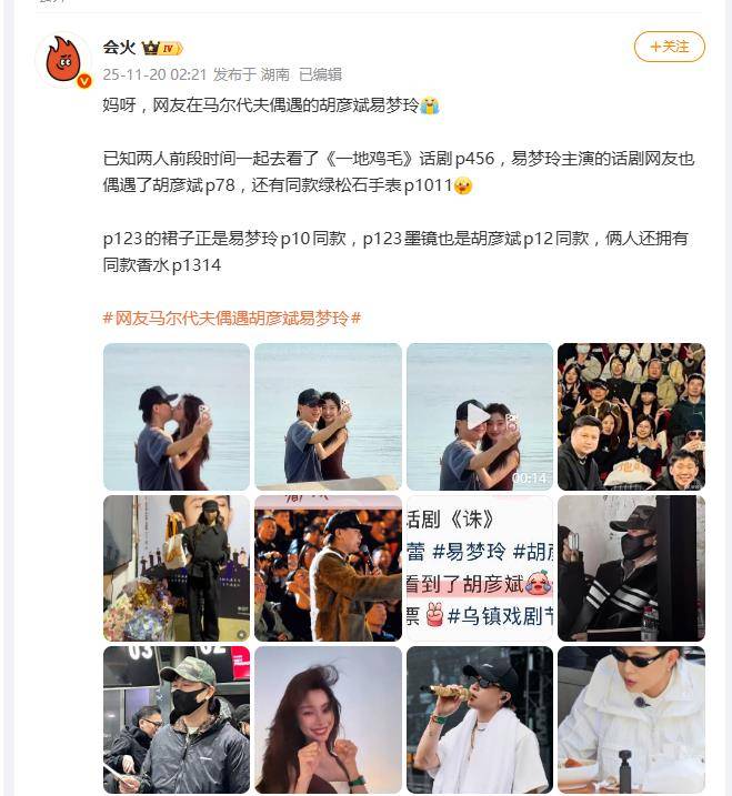 这波恋情的“实锤”可谓层层加码。视频里,易梦玲身穿的裙子和她在抖音晒出的款式完全一致,而两人手上戴的同款绿松石手表、同款墨镜、同款香水,更是被网友盖章为“情侣标配”。时间线也卡得死死的:11月14日张一山话剧首演,两人并肩坐在观众席,胡彦斌的穿搭与现场合照完全吻合;回溯到10月22日易梦玲参演话剧时,胡彦斌也曾现身观众席支持;就连9月1日,两人还一起出席了同一场结课活动。从北京到马尔代夫,短短几个月内多次“巧合”同框,想不让人多想都难。