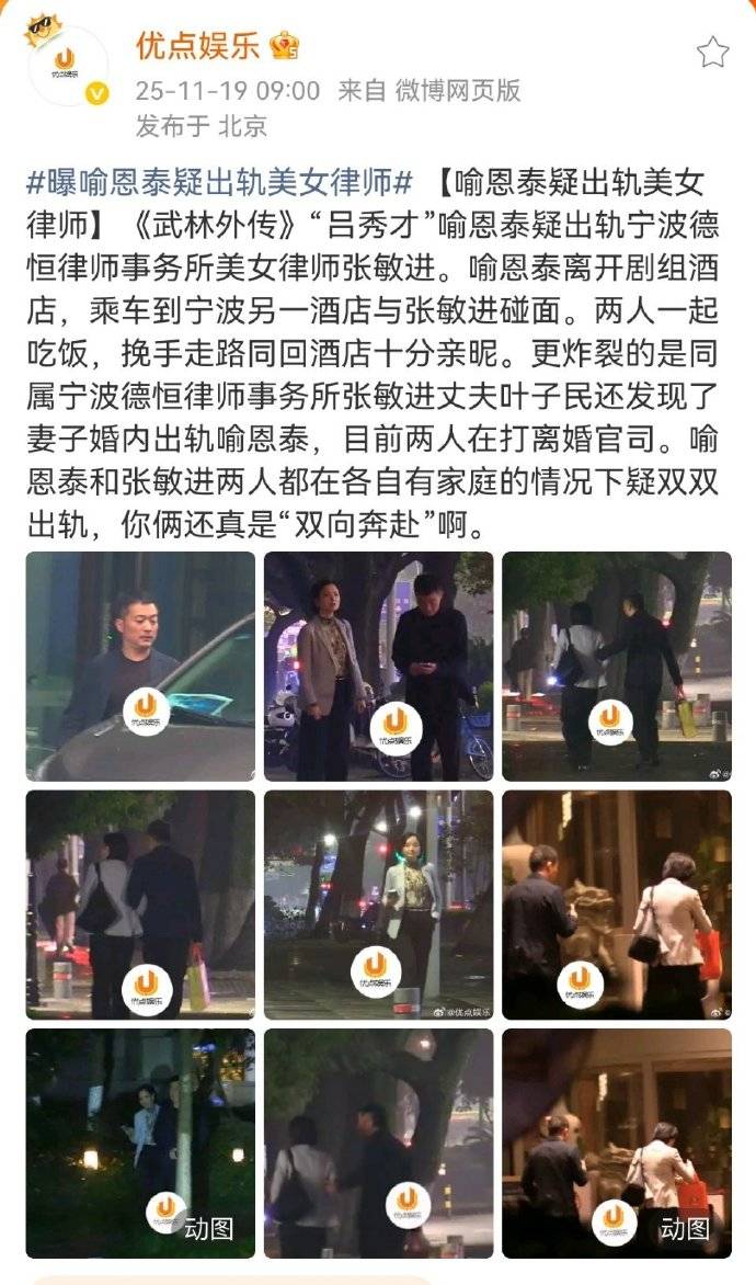 就在网友痛批“史林子欺人太甚”时,剧情突然上演“惊天反转”——八卦媒体同日曝光喻恩泰与宁波律师张敏进挽手同行、共进晚餐、同返酒店的亲密画面。更戏剧性的是,张敏进的丈夫叶子明已因妻子出轨提起离婚诉讼!这下好了,夫妻二人双双被卷入出轨疑云,被网友调侃为“各玩各的平行宇宙”。