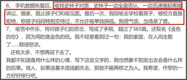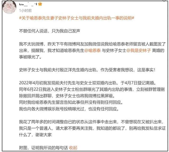 然而随后,史林子的出轨对象付某的前妻发声了,证实了史林子介入自己婚姻,导致离婚。自己是在2022年4月初发现两人不正当关系,离婚后同年6月,她就曾留言给喻恩泰,爆料其妻子出轨的事,这一点也跟喻恩泰好友的爆料对上了。根据好友的爆料,喻恩泰就是看到了留言,才想着 去恢复史林子手机聊天记录,结果恢复之后让他大跌眼镜。