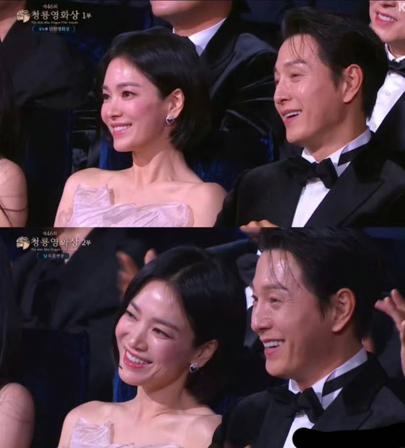 这是韩国电影史上极为罕见的一幕,夫妻俩领奖时,台上台下都沸腾了,掌声停不下来。镜头搞笑地捕捉到玄彬的前女友宋慧乔的面部表情,她也在礼貌地开心鼓掌。却有好事的网友感叹,宋慧乔这是看红了眼。不知是不是羡慕又嫉妒?