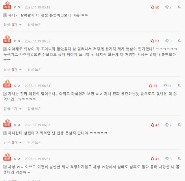 没想到,这波操作非但没掀起跟风嘲讽,反而引来全网反击。评论区瞬间沦为大型“教做人”现场:“就算JENNIE真胖了,也比你这辈子能瘦到的程度更苗条哈哈”、“她穿上下都紧身的衣服,坐下时肌肉自然挤压,这都能被说成长胖?笑死”。更有网友直戳发帖人痛点:“如果你相貌平庸还一无所有,至少学学怎么做个人”、“得活得多可悲才会把日子过成这样?”