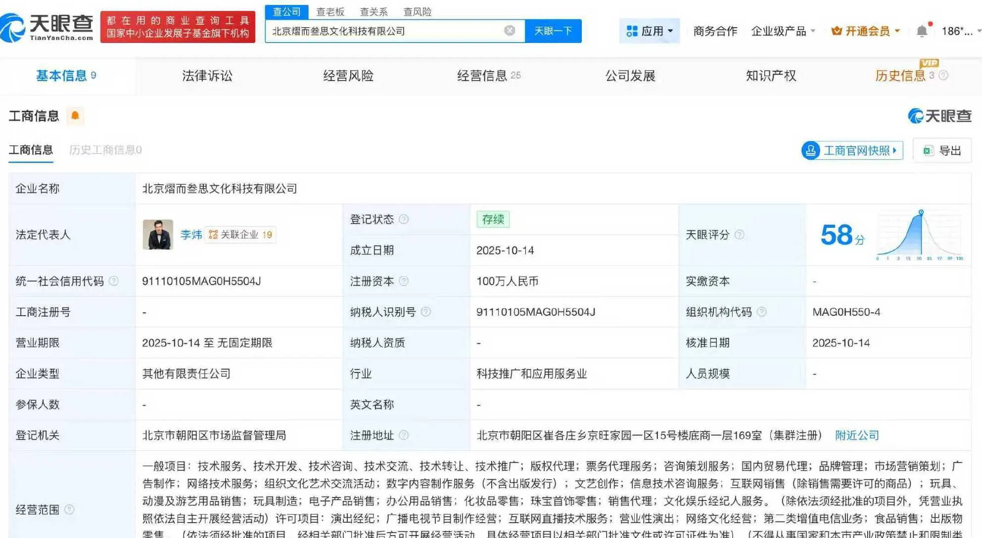 天眼查App显示,赵露思工作室关联公司北京熠而叁思文化科技有限公司成立于今年10月,法定代表人为李炜,注册资本100万人民币,经营范围包括版权代理、票务代理服务、咨询策划服务等。该公司由深圳市千茫文化传媒有限责任公司、湖南甜梦文化传媒有限公司共同持股。