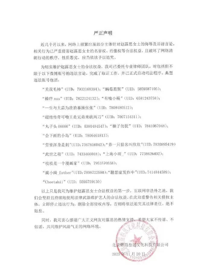 11月20日,赵露思工作室官微发布严正声明:近几个月以来,网络上频繁出现部分主体针对赵露思女士的侮辱及诽谤言论相关行为已严重侵害赵露思女士的名誉权、肖像权等合法权益。为
