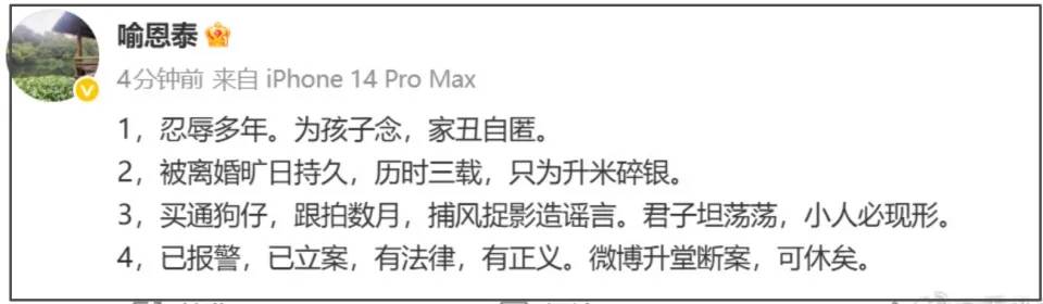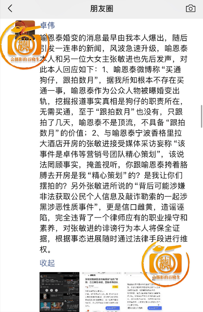 男演员喻恩泰婚变风波持续发酵,几方人马陆续下场发声,每个人都各执一词,让网友直呼抓马。目前,首曝喻恩泰婚变消息的卓伟,也发朋友圈回应了。