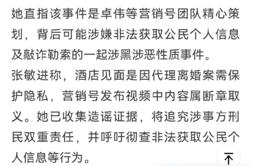 同时卓伟否认非法获取公民个人信息及敲诈勒索,痛批张敏进造谣诬陷,违背了一个律师应有的职业操守和素养,他将保全证据,根据事态进展随时通过法律手段进行维权。