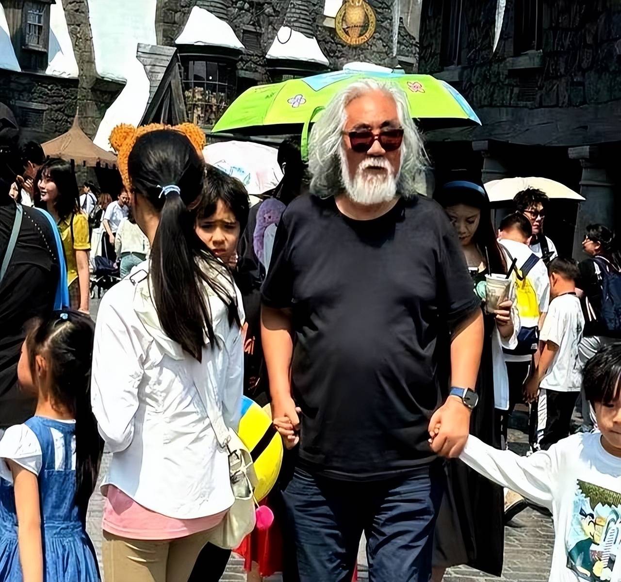 哪怕是在大热天里出门旅行,张纪中也是一手牵一个娃,充分担起父亲的责任。他形象很特别、心态很年轻。