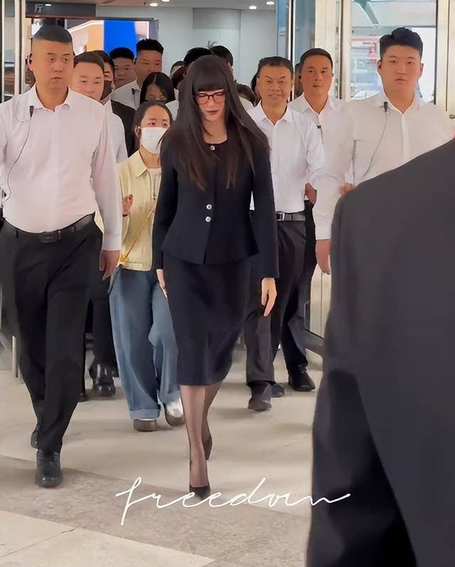 江疏影穿着黑色西装裙套装,包臀裙把身材曲线勒得那叫一个明显,脚上黑丝配高跟鞋,妥妥的身材火辣御姐范儿。