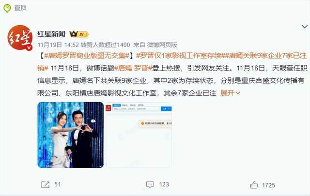 早前,曾有媒体通过某软件查询得知,唐嫣名下共关联9家企业,其中2家为存续状态,罗晋名下共关联4家企业,仅罗晋(上海)影视文化工作室为存续状态,其余3家企业已注销,查关系信息显示,唐嫣与罗晋无商业关联。