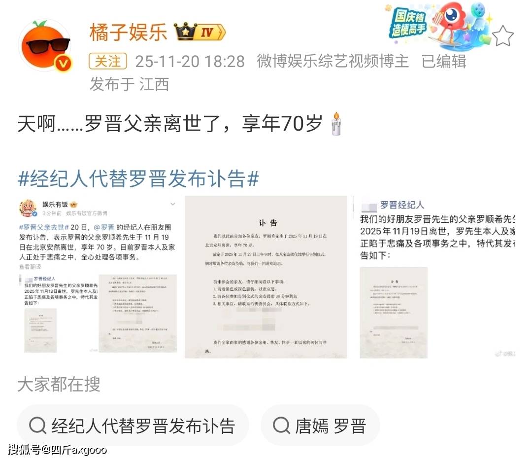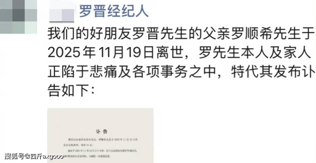 媒体“橘子娱乐”爆料,演员罗晋的经纪人于朋友圈代为发布讣告,对外证实罗晋的父亲不幸离世。