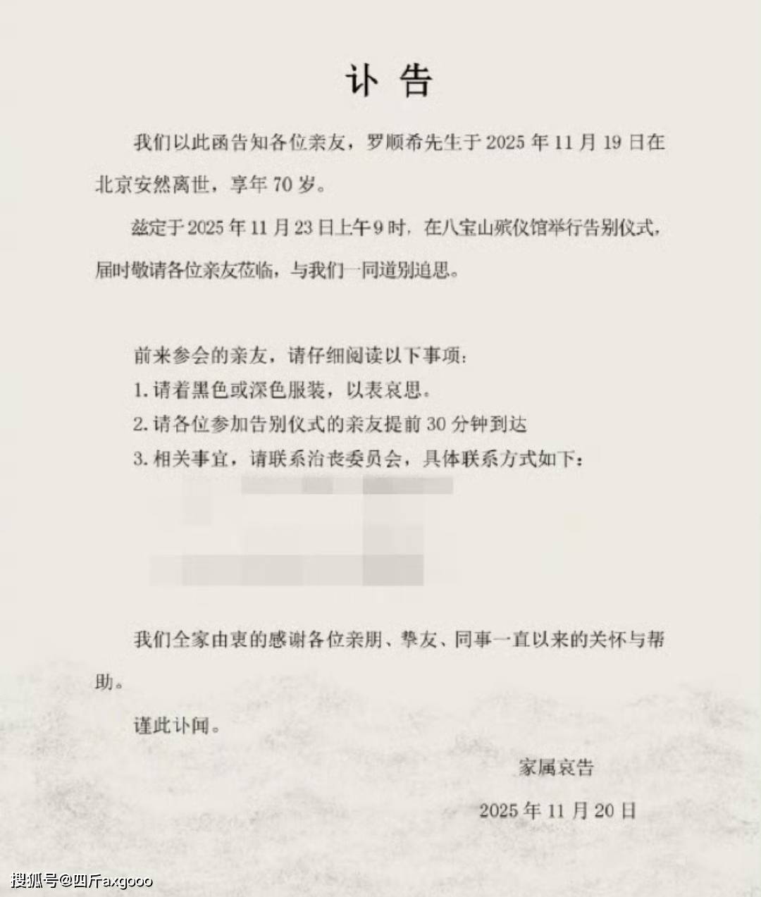 讣告内容不多,只是说了演员罗晋的父亲罗顺希11月19日在北京去世,享年70岁,告别仪式已经定在了23号,希望亲朋好友都能过来。