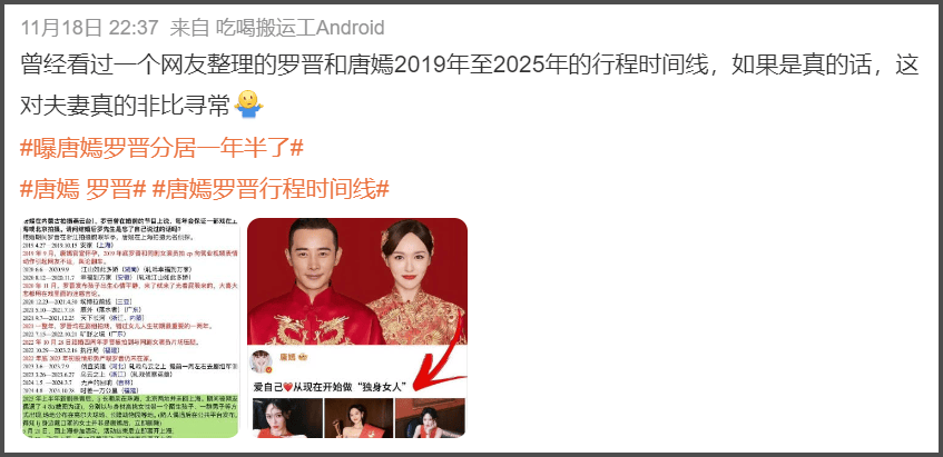 有网友还做出了两人之间的行程时间线,怎么说呢?两人拍戏都挺忙的,尤其是近几年唐嫣事业也好起来了,基本都在不断进组。唐嫣的ip地址基本长期在上海,罗晋的ip地址也基本都在北京,甚至被传出分居一年半的消息。