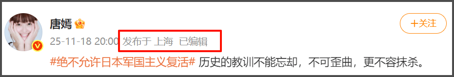 不过唐嫣社媒倒是一直在更新,更为微妙的是,罗晋父亲去世的前后两天,唐嫣发布博文的ip地址却都在上海。难道她没有陪在罗晋身边,在北京送老人家最后一程吗?