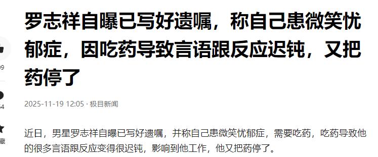 信息来源:极目新闻——罗志祥自曝已写好遗嘱,称自己患微笑忧郁症,因吃药导致言语跟反应迟钝,又把药停了