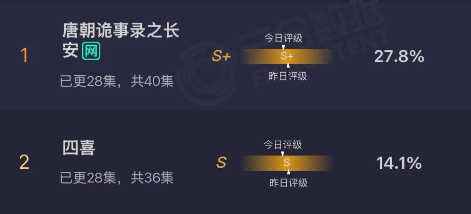 据云合数据,《四喜》在网络端的播放量也不及《唐朝诡事录之长安》,后者的市占率高达27.8%,而《四喜》仅有14.1%。