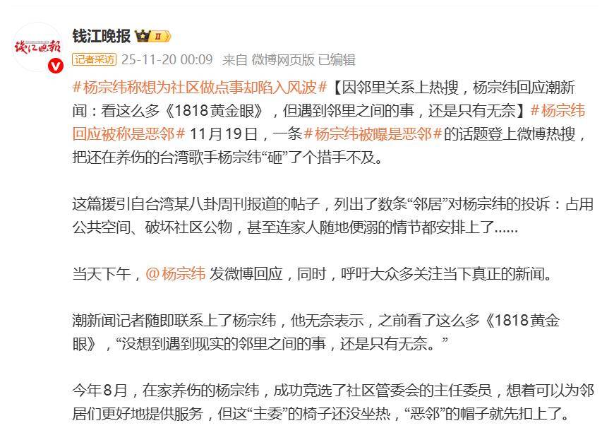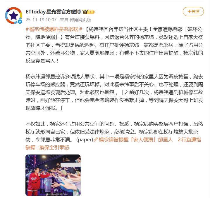 这场风波的源头,要追溯到一场意外和一次社区选举。2025年8月,杨宗纬因演唱会意外摔伤,右手骨裂、六根肋骨断裂,返台休养。在此期间,他当选了社区管理委员会主委,意图整改物业存在的问题。没想到,这一举动却点燃了矛盾的引线。