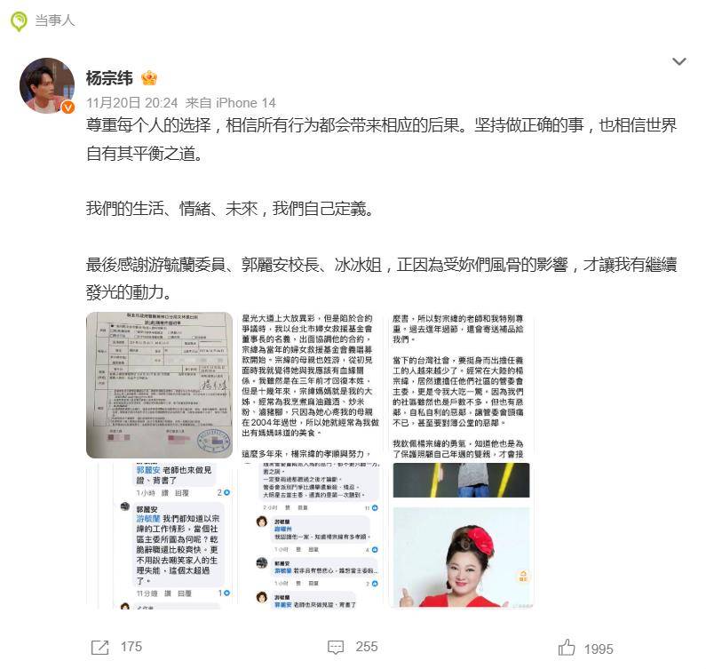 圈内友人也纷纷声援。与前台北妇女救援基金会董事长游毓兰有十几年交情的她,称赞杨宗纬孝顺父母、照顾姐弟,并揭露社区存在“自私恶邻”长期骚扰管委会。教育家郭丽安则质疑爆料动机:“杨宗纬工作繁忙,若非为保护年迈双亲,何必担任主委?”并批评相关指控“嘲笑家人生理失能太超过”。资深艺人白冰冰也在受访时强调:“宗纬低调客气,接手主委是受住户恳请,只为帮父母分担压力。”