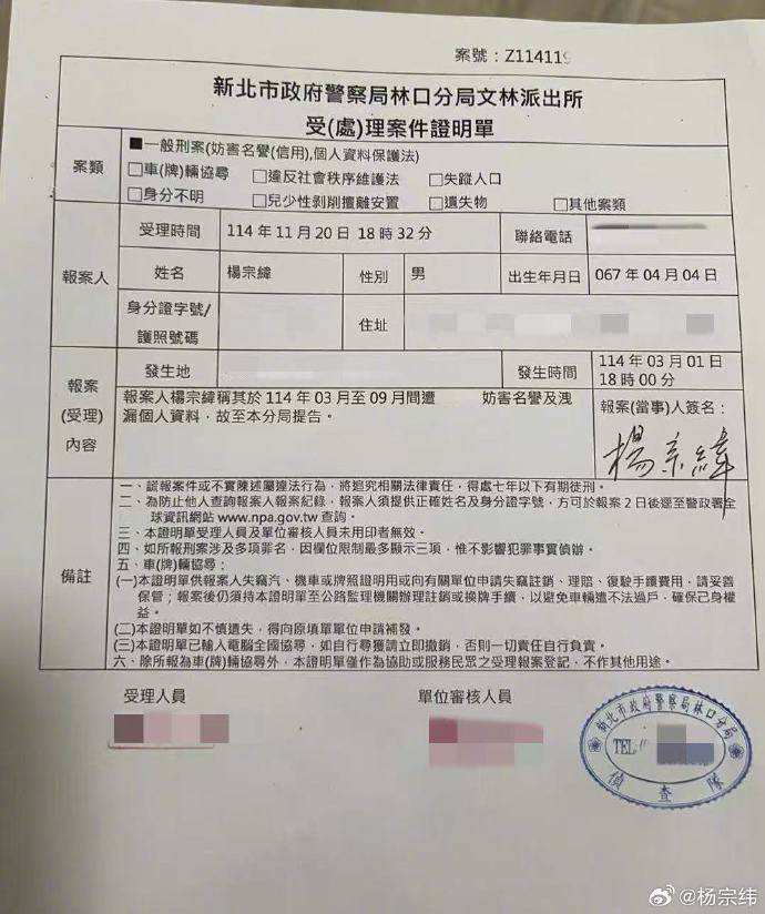 一向低调的歌手杨宗纬,这回用一纸报案单强势回应了持续数月的“恶邻”风波。2025年11月20日,他正式向新北市警局报案,指控自己在同年3月至9月期间遭受网络诽谤与隐私泄露,案由直指“妨害名誉罪”和违反《个人资料保护法》。