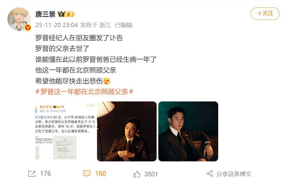 从2024年底到2025年11月父亲离世,罗晋毅然推掉了包括两部男主角戏约在内的所有工作,长期留守北京,全心照顾病重的父亲。作为中国煤矿文工团的体制内演员,他不得不在医院和单位之间“两点一线”奔波,多次被拍到佩戴着医院陪护腕带匆忙往返。这种近乎“隐身”的状态,直到11月20日经纪人通过朋友圈代发讣告,才得以解释。