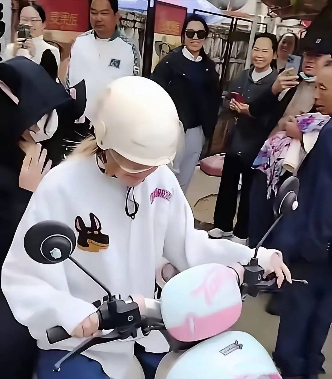 全红婵的妹妹穿了一件宽松的白色卫衣、牛仔裤,她染了金黄色的头发、看起来洋气了许多。因为有太多人围观,妹妹戴着头盔、低着头,并不像回应,她看起来有点害羞。
