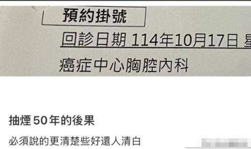 紧接着甚至直接晒出医院挂号单,说自己抽烟50年得了小细胞肺癌,但正在积极治疗,“再活几年没问题”。