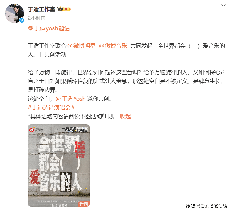 于适不仅在表演领域展现出非凡的实力,在音乐方面同样有着独特的才华。此次演唱会,相信他将精心筹备,为观众带来一场融合了精彩演唱、劲歌热舞的视听盛宴。粉丝们纷纷在评论区留言表达期待:“终于等到于适的演唱会,一定要去现场感受他的舞台魅力”“合肥见,期待于适在舞台上大放异彩”。