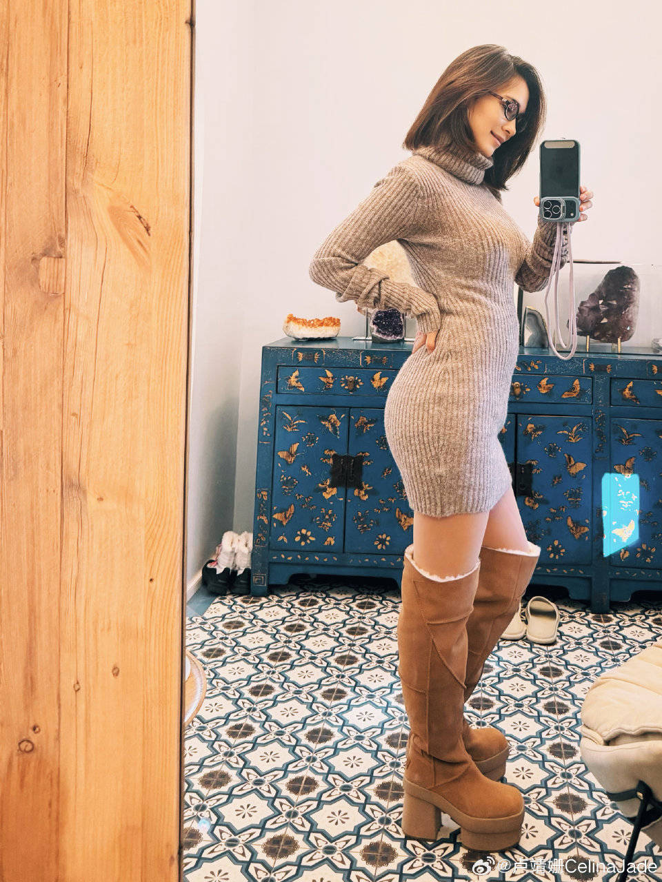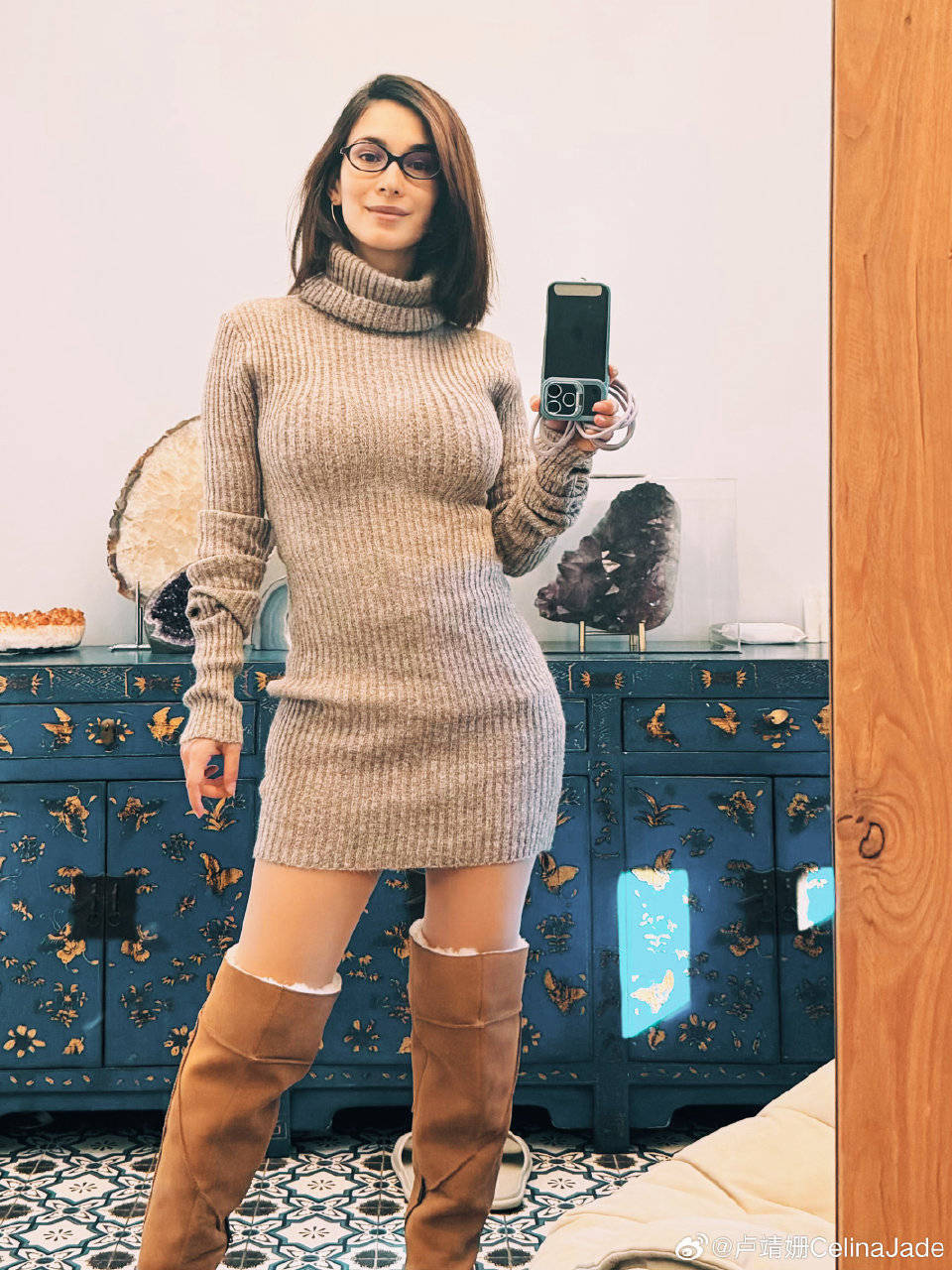 而且生完孩子后需要母乳喂养,所以上围傲人,更显丰满,搭配着棕色长筒棉靴还是恨天高,十分的时尚和自带欧美风,秀S线的时候小腹是一点赘肉都没有,完全看不出是刚生产完的样子了。
