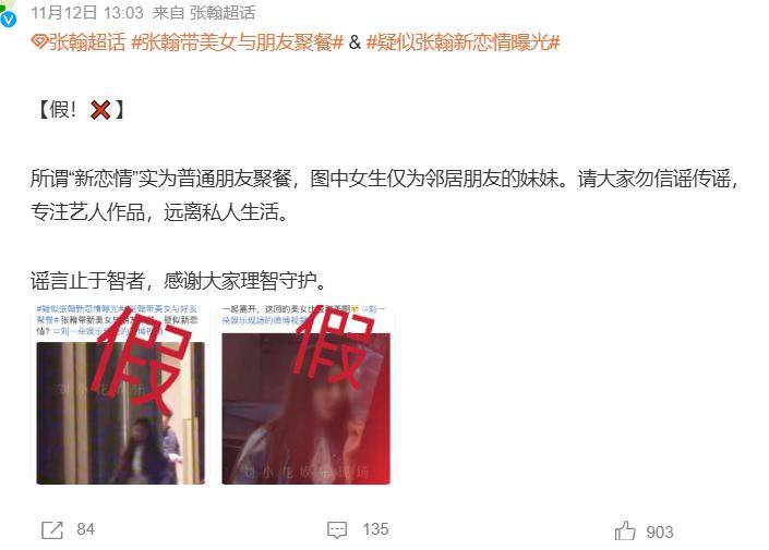 张翰随后也出来辟谣了,称对方只是邻居家妹妹。