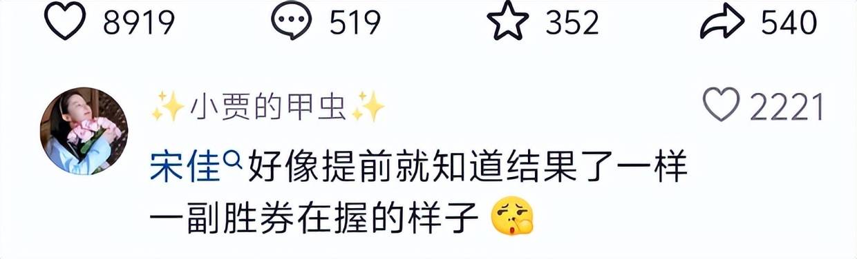 颁奖直播上宋佳的表情一直都气定神闲,也让不少网友猜测,她是知道了结果,才会有这种表情。