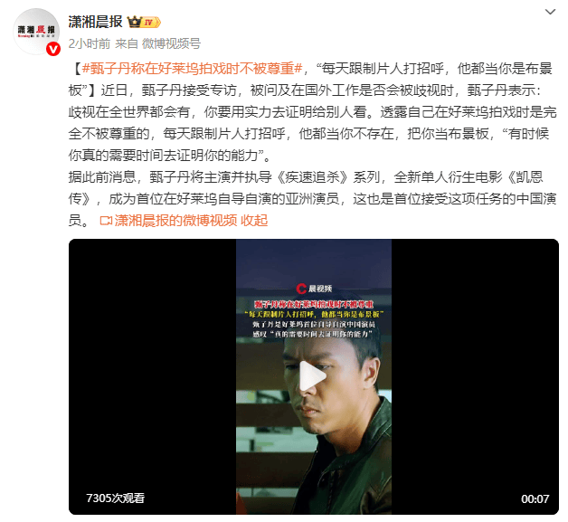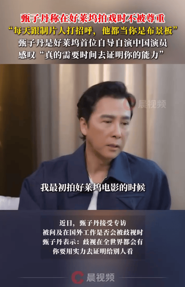 近日,甄子丹接受专访,被问及在国外工作是否会被歧视时,甄子丹表示:“歧视在全世界都会有,你要用实力去证明给别人看。”他透露自己在好莱坞拍戏时是完全不被尊重的,“每天跟制片人打招呼,他都当你不存在,把你当布景板”,“有时候你真的需要时间去证明你的能力”。