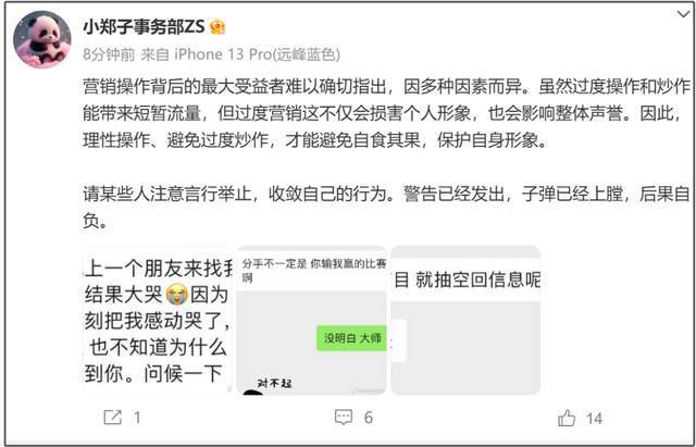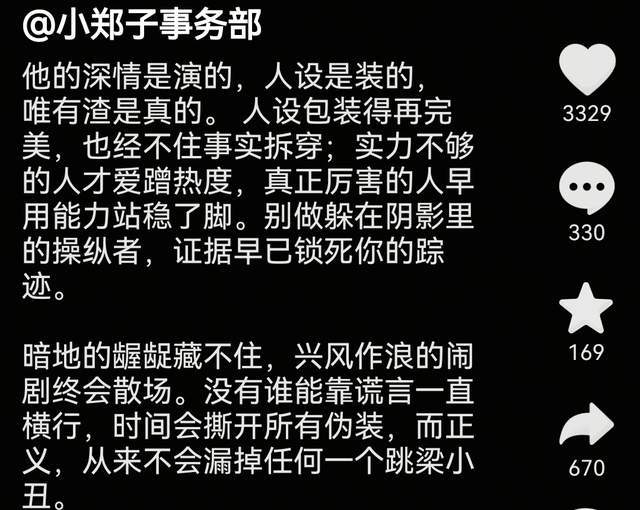 该账号还再度提到,“实力不够的人才爱蹭热度”,喊话别躲在阴影里操纵。此前,郑爽工作室曾晒工作室指责胡彦斌过度炒作,内涵他踩着郑爽把自己营销成“纯爱战神”。如今胡彦斌曝光新恋情,郑爽又被拉出来做比较,怪不得会发文内涵。