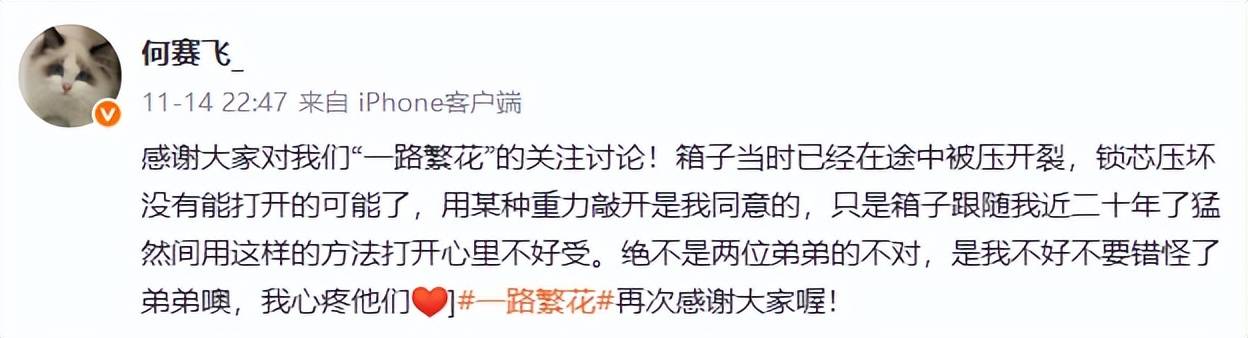 不过,何赛飞还是比较体面的,在网上对柯淳、邵子恒的骂声逐渐不受控后,她主动出来为弟弟们解释道:“箱子当时已经在途中被压开裂,锁芯压坏没有能打开的可能了,用某种重力敲开是我同意的,只是箱子跟随我近二十年了猛然间用这样的方法打开心里不好受。”
