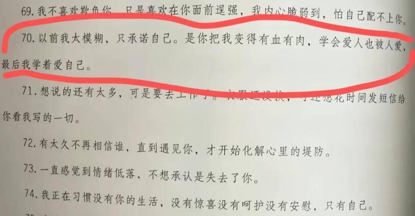 其中一句话让人印象深刻,她说:“以前我太模糊,只承诺自己。是你把我变得有血有肉,学会爱人也被人爱,最后我学者爱自己。”