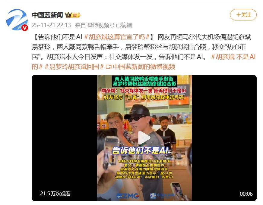 11月21日,胡彦斌和易梦玲并肩回国的机场画面,直接让一场围绕“AI合成”的恋情疑云彻底破案。面对围观的镜头和粉丝,胡彦斌不仅主动搂住易梦玲肩膀,更喊出了一句重磅宣言:“你们社交媒体发一发,告诉他们不是AI!”——这波操作,被网友精准解读为“变相官宣”。