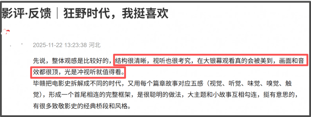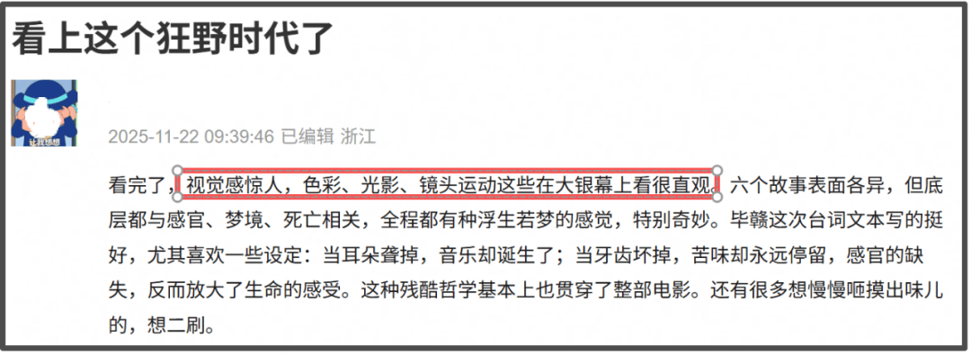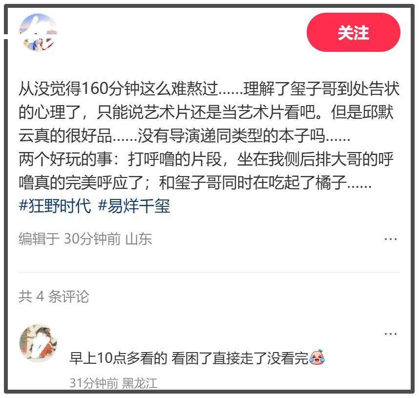 艺术电影也好,粉丝电影也罢。《狂野时代》的票房成绩大概率逃不过高开低走的命运了,希望追求艺术的导演们也能多多考虑普通观众的感受,叙事和艺术从来都不是不可兼得的,包裹在“艺术”皮囊之下的曲高和寡又何尝不是一种导演对观众展现出的自上而下的傲慢呢?