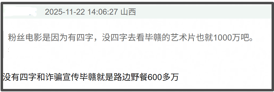 定位为文艺片的电影,在预售已经突破一亿票房的情况下,票房最终落点仅仅2亿,这样的票房结构是否意味着该片可以被称为是粉丝电影?上映前,粉丝冲着偶像冲预售票房;上映后,粉丝为了偶像走进电影院,继续为偶像“氪金”。有网友大胆推测,如果该片的主演不是易烊千玺的话,那么票房可能连一千万都突破不了。