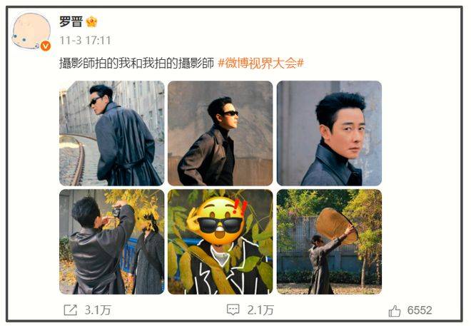 11月3日时,罗晋晒出一组参加微博视界大会的拍摄照片,除了有摄影师给他拍摄的,居然还有他给摄影师拍摄的角度。