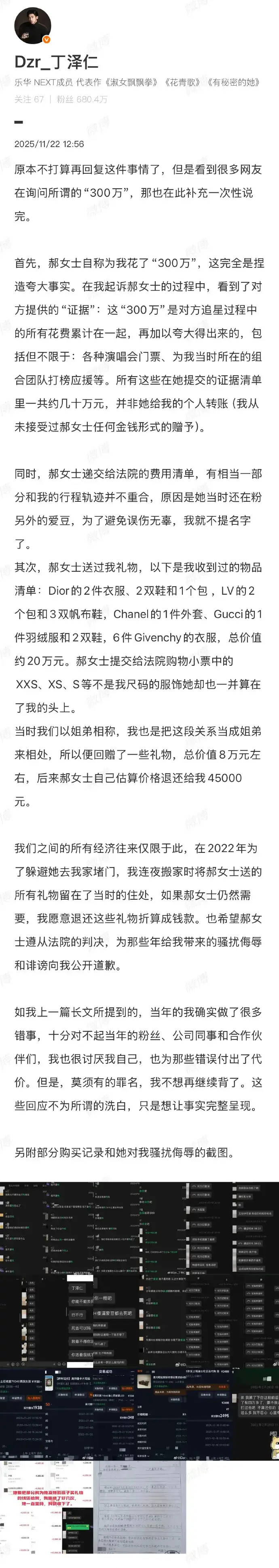 22日,丁泽仁再发文回应“唯一的姐”相关争议,他否认对方为他花了300万,并表示他愿意退还礼物和钱款:“也希望郝女士遵从法院的判决,为那些年给我带来的骚扰侮辱