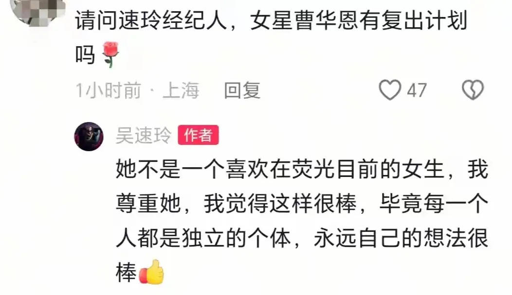 当天,曹格前妻回应网友留言谈女儿Grace是否出道,她表示:“她不是一个喜欢在荧光幕前的女生,我尊重她,我觉得这样很棒,毕竟每一个人都是独立的个体。”