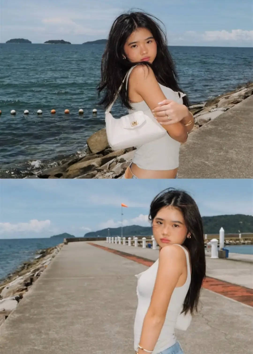 22日,曹格女儿近照曝光,15岁Grace穿白色露腰背心在海边拍照,自信摆拍好有范儿,变得愈发漂亮了!