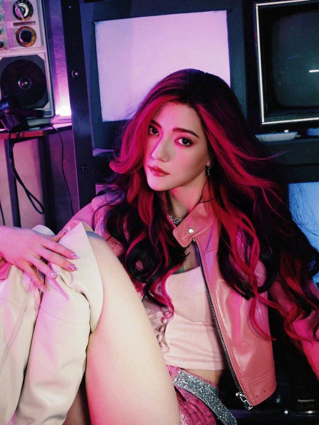 娜然穿着红色皮衣,搭配白色衣裳和粉色短裤,她俏脸明艳,长发染成红色,这位美女坐在那里,露出自己的修长的大美腿,绝对性感妖艳!