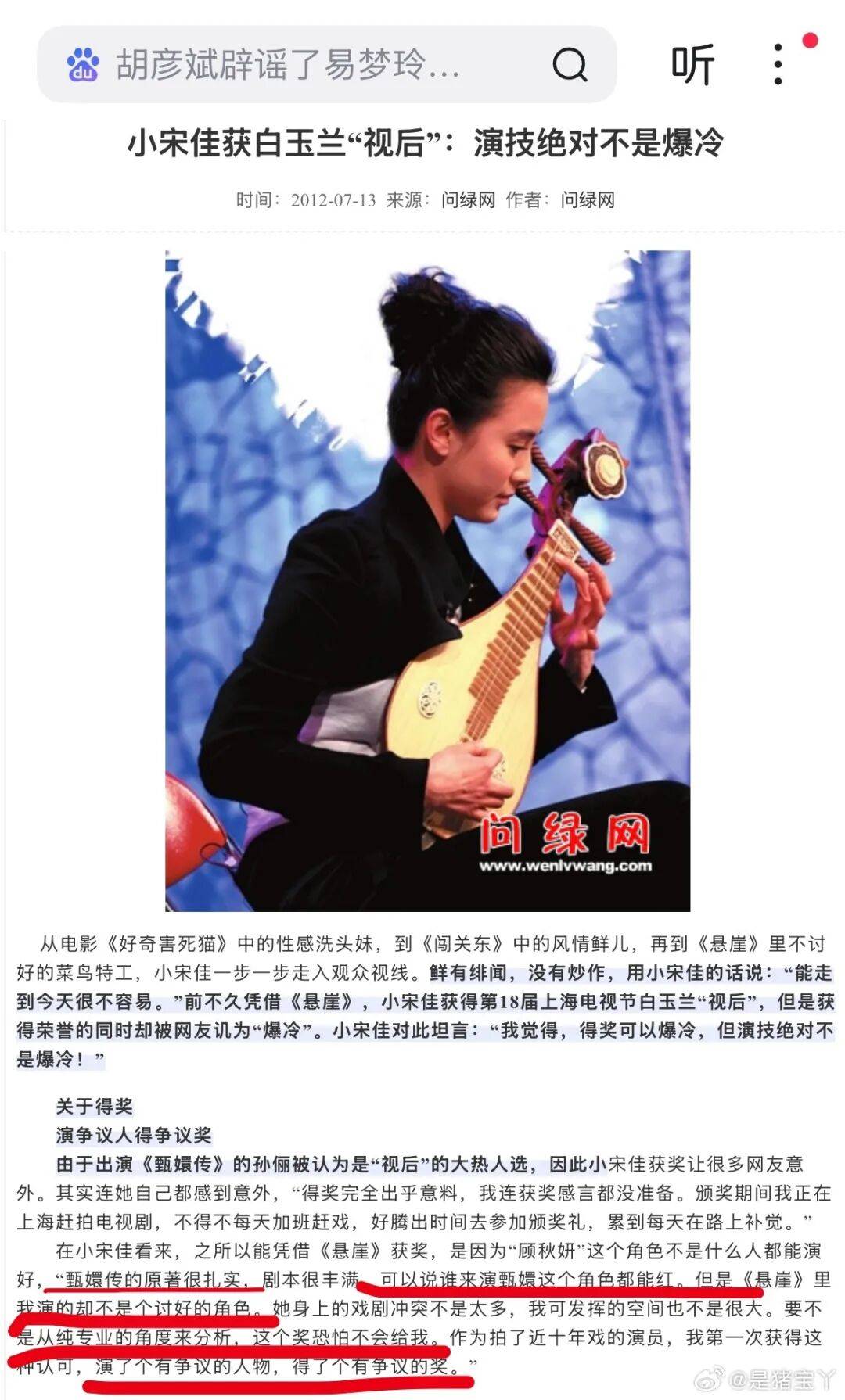 当年,《悬崖》击败《甄嬛传》摘得白玉兰影后,宋佳对《甄嬛传》谁演都能红的吐槽,这个争议事件伴随其后宋佳不断续获奖史反复被翻出。