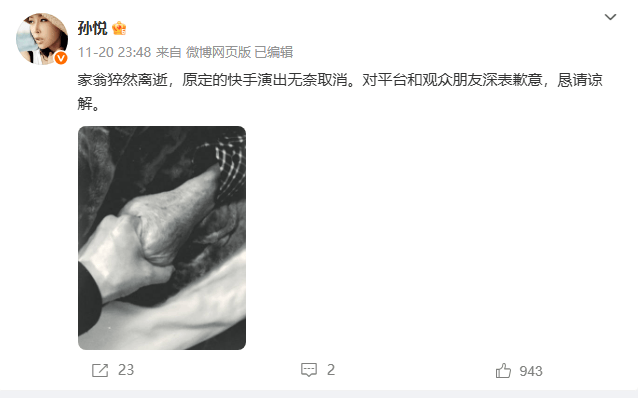 近日,孙悦在社交平台上发文称“家翁猝然离逝,原定的快手演出无奈取消。对平台和观众朋友深表歉意,恳请谅解。 ”在孙悦发出的照片中可以看到,两只手紧紧握在一起。据